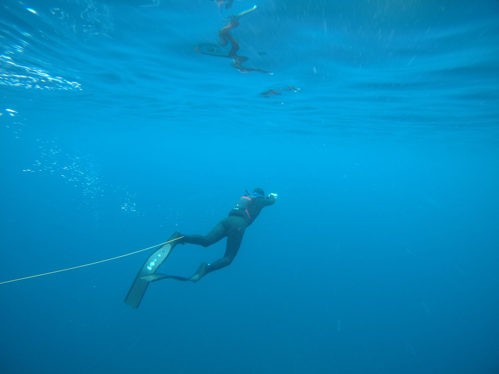 The moment when you notice that you can’t see the seabed anymore is always special. Immersing yourself into the blue with all its forces gives you this new sensation that is linked to so many emotions. After a while, I found my flowdiving rhythm and gliding through the deep water became easier. Flowdiving is a diving technique that is inspired by dolphins. We use it to cover long distances in the water. During flowdiving you dive down below the surface for a few metres, before shortly breaking the water surface with the snorkel to breath and then immediately going back down again. It takes some training and breathing exercise to succeed but it is a very effective way to move from A to B.