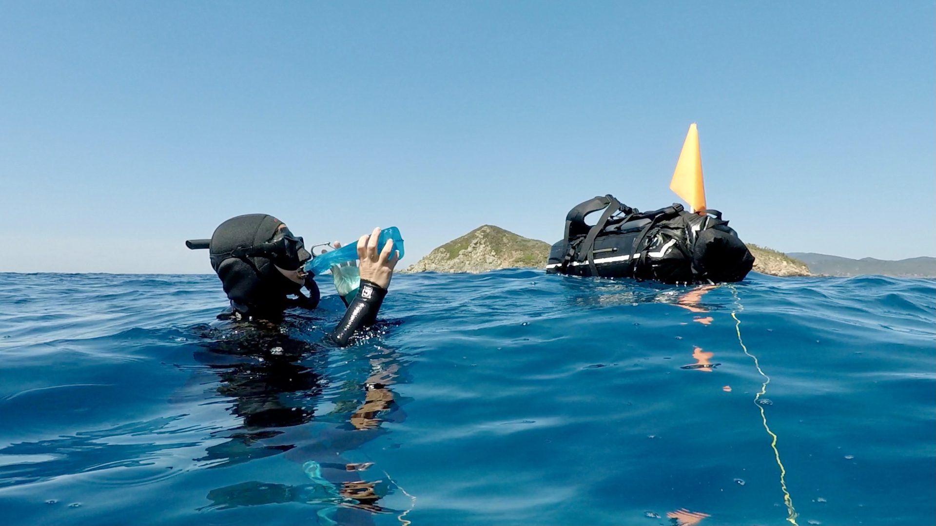 All needed things, such as food, sleeping bag, mattress and dry clothes are packed in a floating streampack, which can be blown up and gets pulled with an elastic, long leash that is fixed to your leg, enabling you to carry all your equipment in the sea. You can move freely, are able to dive down and have everything you need for a few days in nature. Just you and the sea.