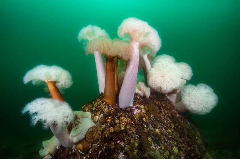 Another favorite dive site is Manomi’s Rocks, a dive site I discovered and is named after my wife. This site is an amazing forest of large 3 to 4 feet towering plumose anemones on top of a large rock formation a few feet below the surface at low tide and an interesting underwater sloping ledge full of life leading down to a large sea grass meadow with more plumose anemones.
