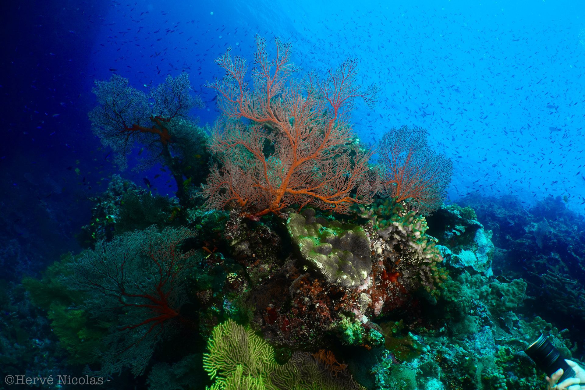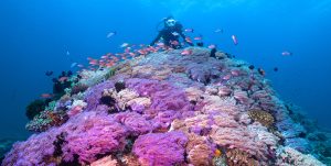 One of my favourite dive sites is Tomoko’s Sea Cave which is spangled with colourful gorgonians, whip corals, and multicoloured anthias. Around the cave, you meet abundant pelagic life and reef fish, including butterflyfish, triggerfish, loaches, scorpion fish, trevallies, napoleon fish… the list goes on. Stunning and colorful flora meets an unbelievable choice of blues here, while strange colours change their hues in the inconsistent light of the cave.
