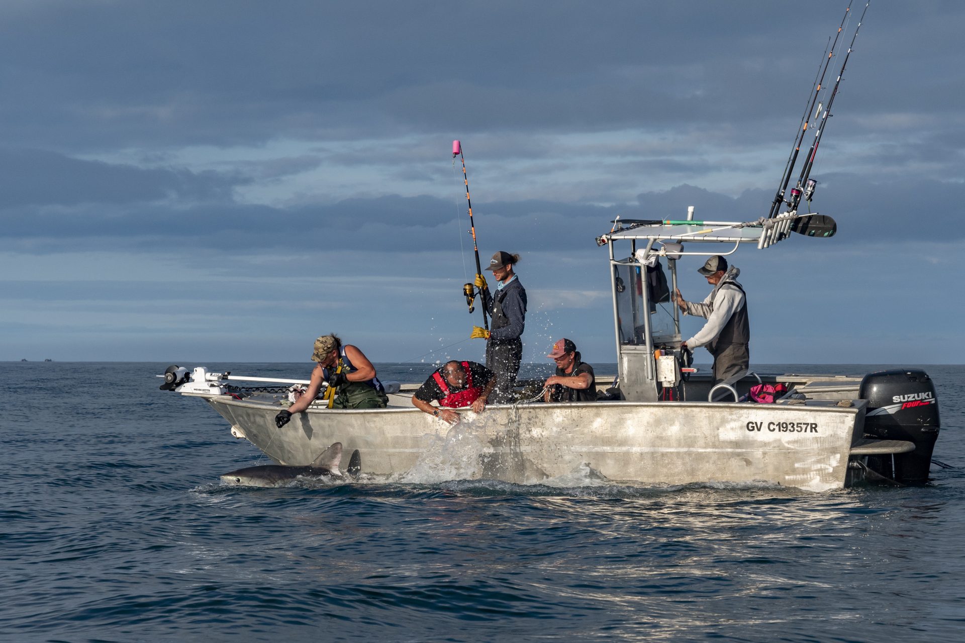 I board one of the three boats that are part of the research mission, and we make our way to the fishing area in only a few minutes. The fishermen prepare their lines and fix mackerels onto tiny circle hooks that are said to limit the risk of injury to sharks during capture. Now the waiting game begins and the fishermen’s boat drifts in the currents for a few hours. Suddenly, the fishing line moves. The fishermen jump up and try to reel in the heavy fish as quickly as possible, while we set up the scientific protocols and acoustic monitoring devices. Porbeagle sharks are powerful animals, but the fishermen act quickly and manage to control the shark by passing a lasso around its caudal fin. This is the signal for our boat to approach.