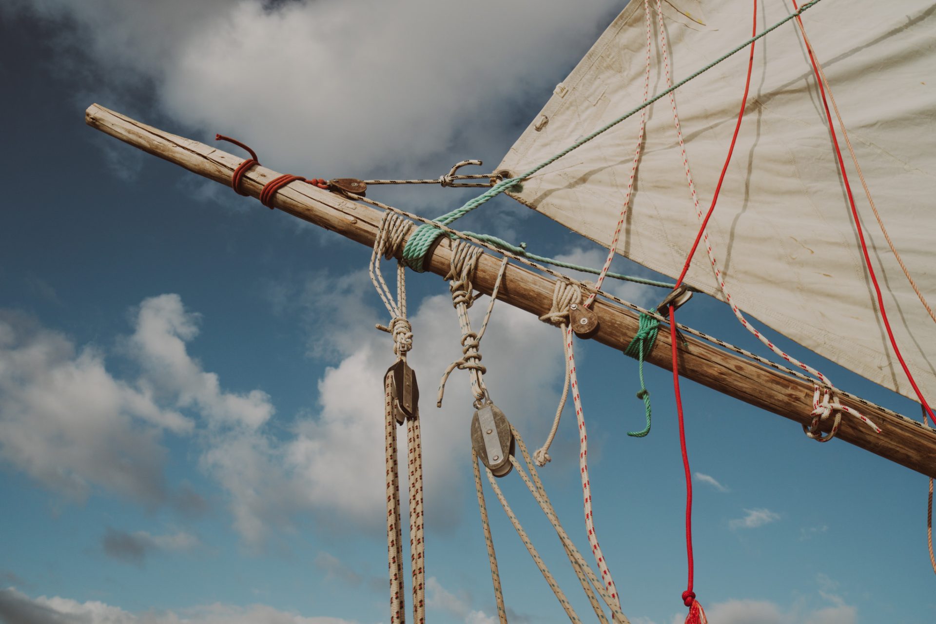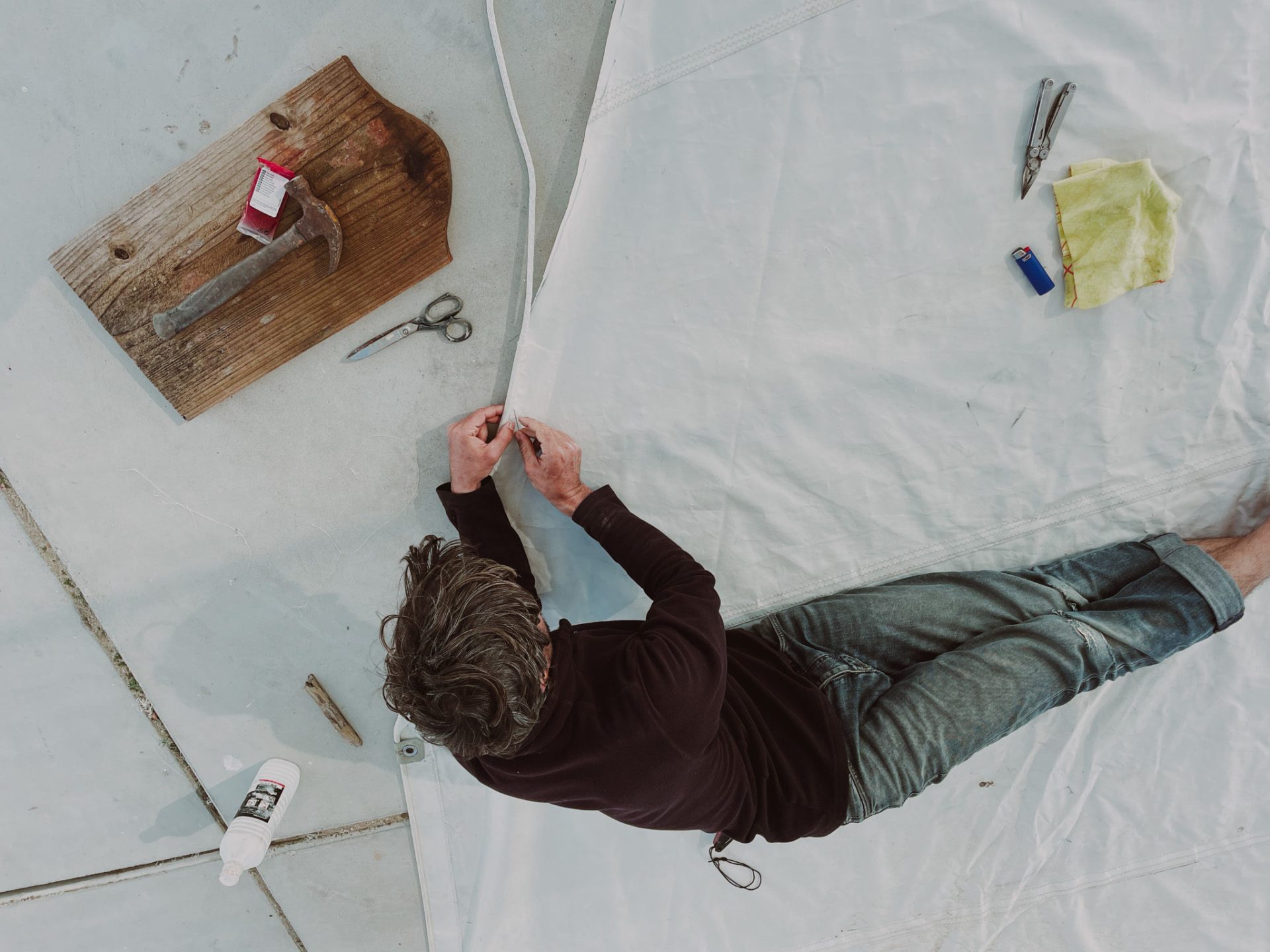 Holding fast to the ethos of simplicity that underlines the philosophy of these vessels, we began applying low-tech techniques in the build, recycling and repurposing as many materials as possible and using only hand tools to get the work done. Sourcing wood from the Azores, we laid and lashed the new deck with lines instead of screws. One day whilst out exploring the coast we discovered a partly sunken wreck and salvaged its perspex windows to use as portholes. We replaced the old mast with a reclaimed wooden electricity pole, lowering and raising it with nothing more than a wooden a-frame, some pullies and lines. We built a custom gaff rig with branches from the forest, and lines donated to us by fellow sailors and fitted it with an old secondhand genoa which we cut and painstakingly hand-stitched to shape. As the weeks and months went by, our once wreck began to bloom into a beautifully unique and rustic ship. Our unlikely cheering squad, the local cockle pickers, seemed to be in complete disbelief of the transformation, often stopping on their commute to and from the tidal flats to inspect the most recent updates and remark “Muito bom”.