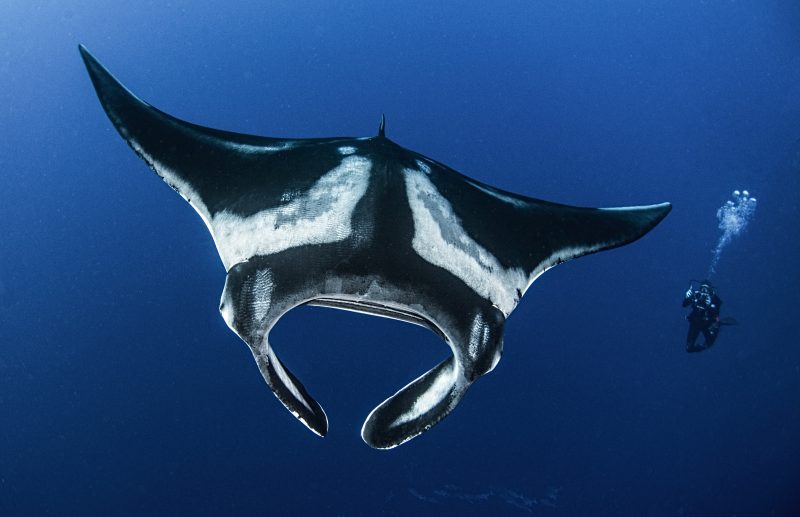 Diver with manta ray (oceanic) at Socorro Islands, Mexico.