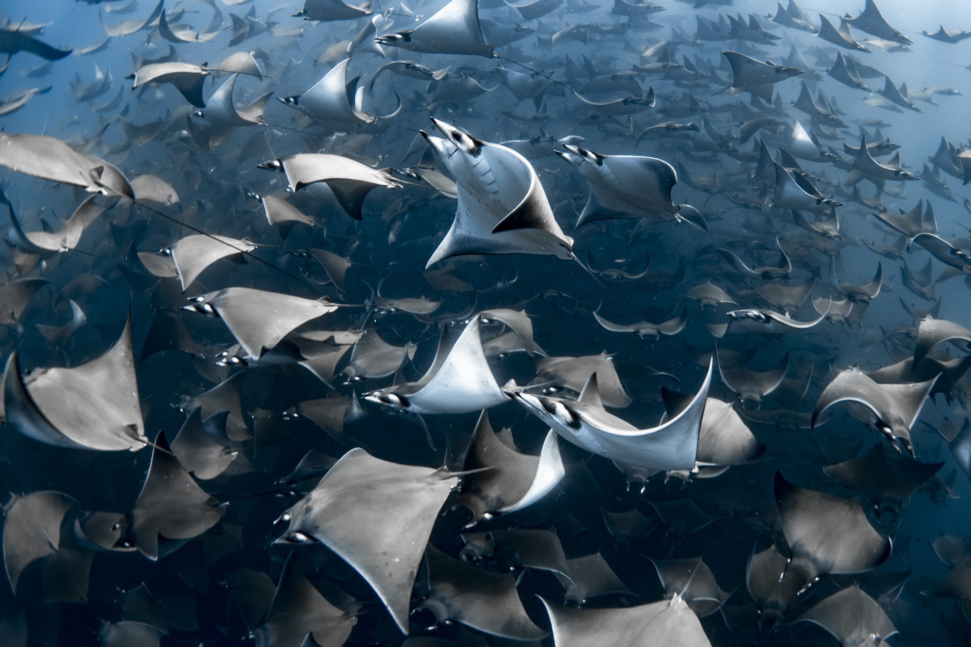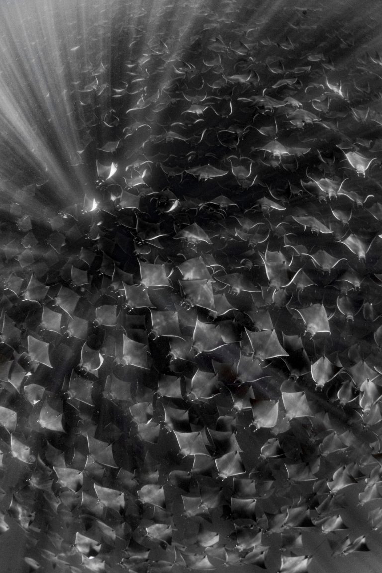 An aggregation of mobula rays in clear waters off Baja California Sur, Mexico. “Mobula rays are incredibly sensitive to movement and sound,” says photographer Nadia Aly, “so I took this photo while freediving. We found this aggregation at a discreet location in mid-morning and stayed with it for four hours. The sun was shining and the ocean was gifting!”